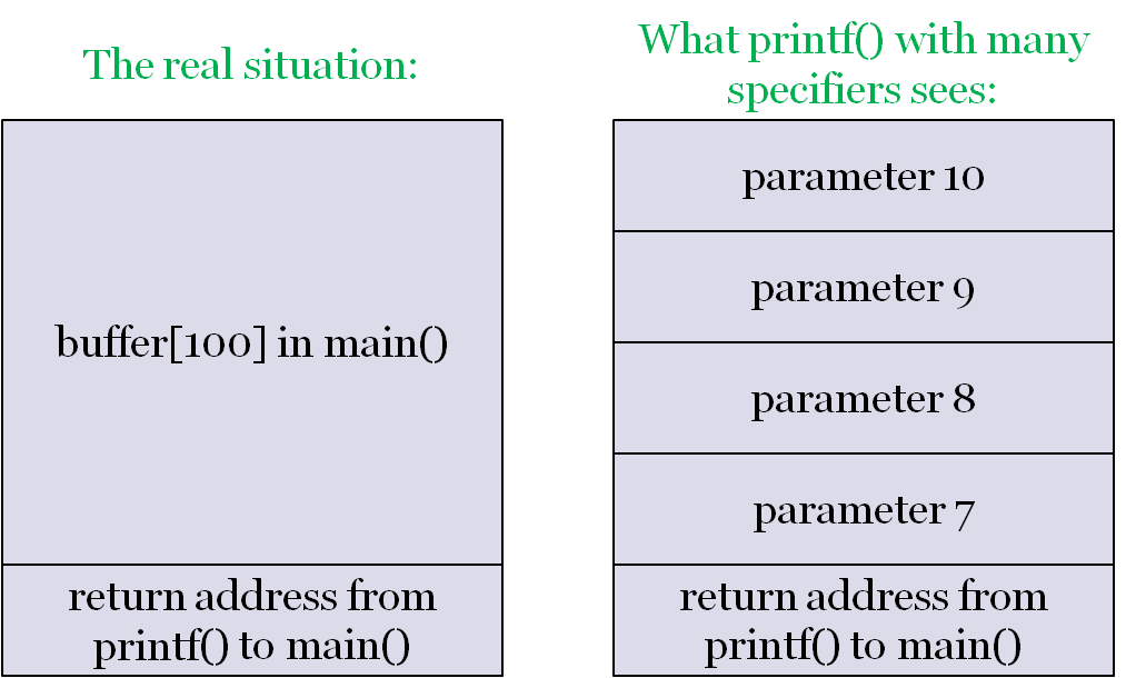 printf(), fprintf(), wprintf(), sprintf(), etc.)printf()) is not a fixed stringvoid vuln(char buffer[256]) {